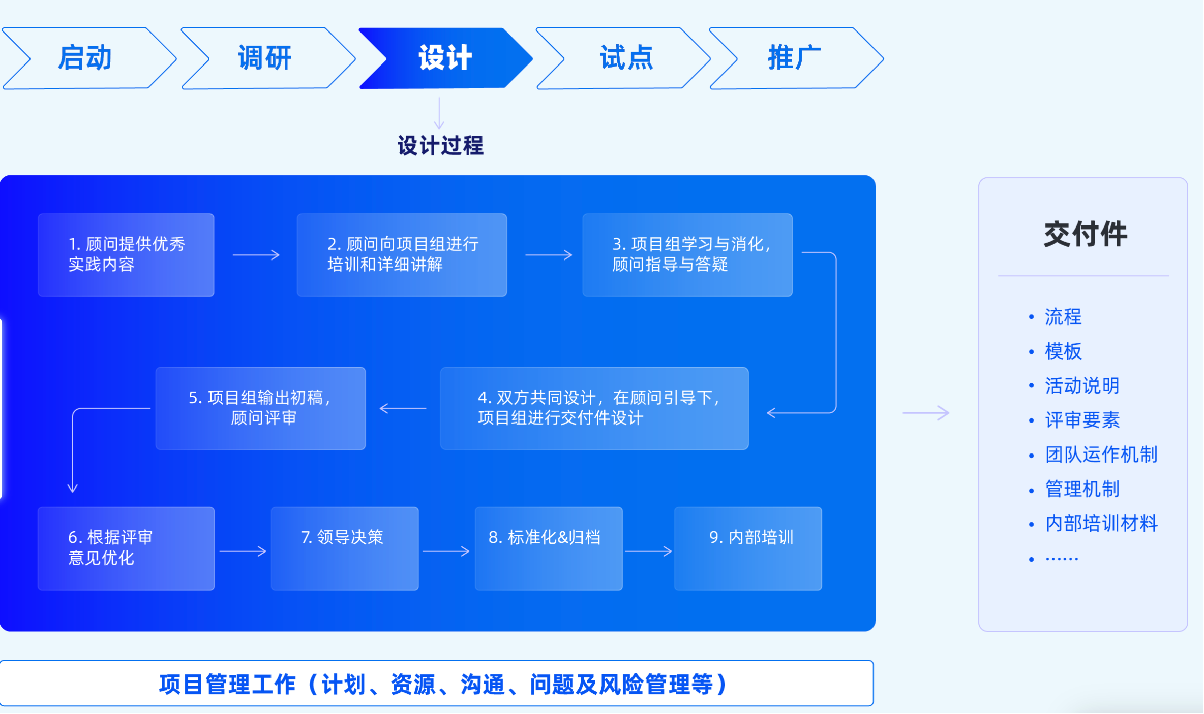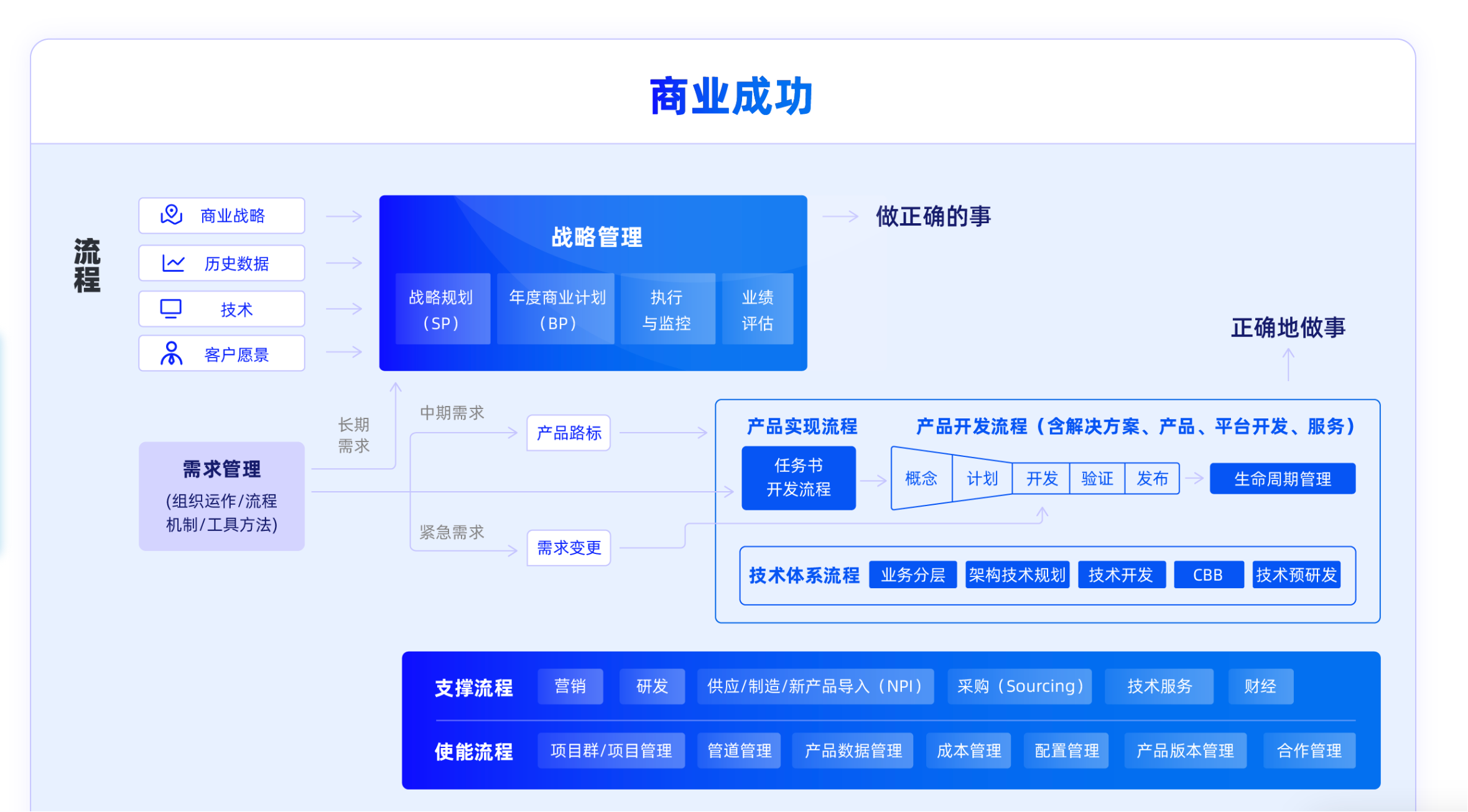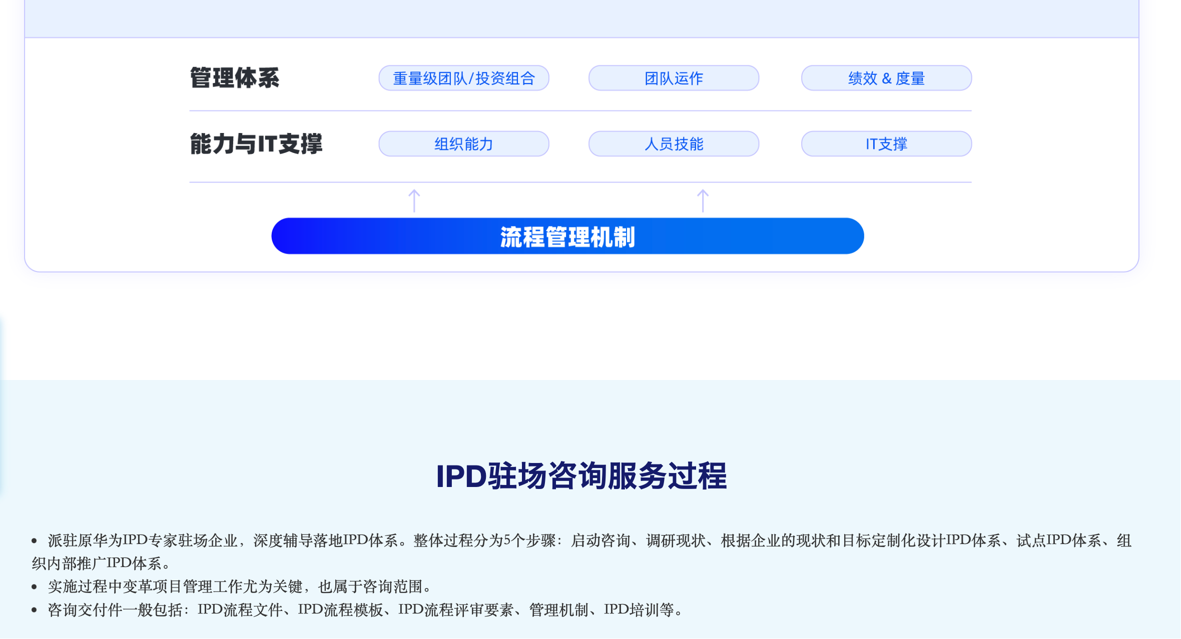 咨询服务范围不仅限于IPD研发流程(即:“小研发”),而是覆盖完整的从战略规划(即:做正确的事)到产品实现(即:正确的做事)的完整体系。 包括以下流程模块:战略管理(战略规划SP、业务规划BP等)、需求管理、产品开发流程,技术体系流程(技术开发、CBB、技术预研等)、支撑流程、使能流程(项目管理、项目群管理、产品数据管理、成本管理、配置管理、版本管理等)、管理机制(重量级团队、投资组合管理、团队运作、绩效和度量等)、组织能力及IT支撑、流程管理机制。
