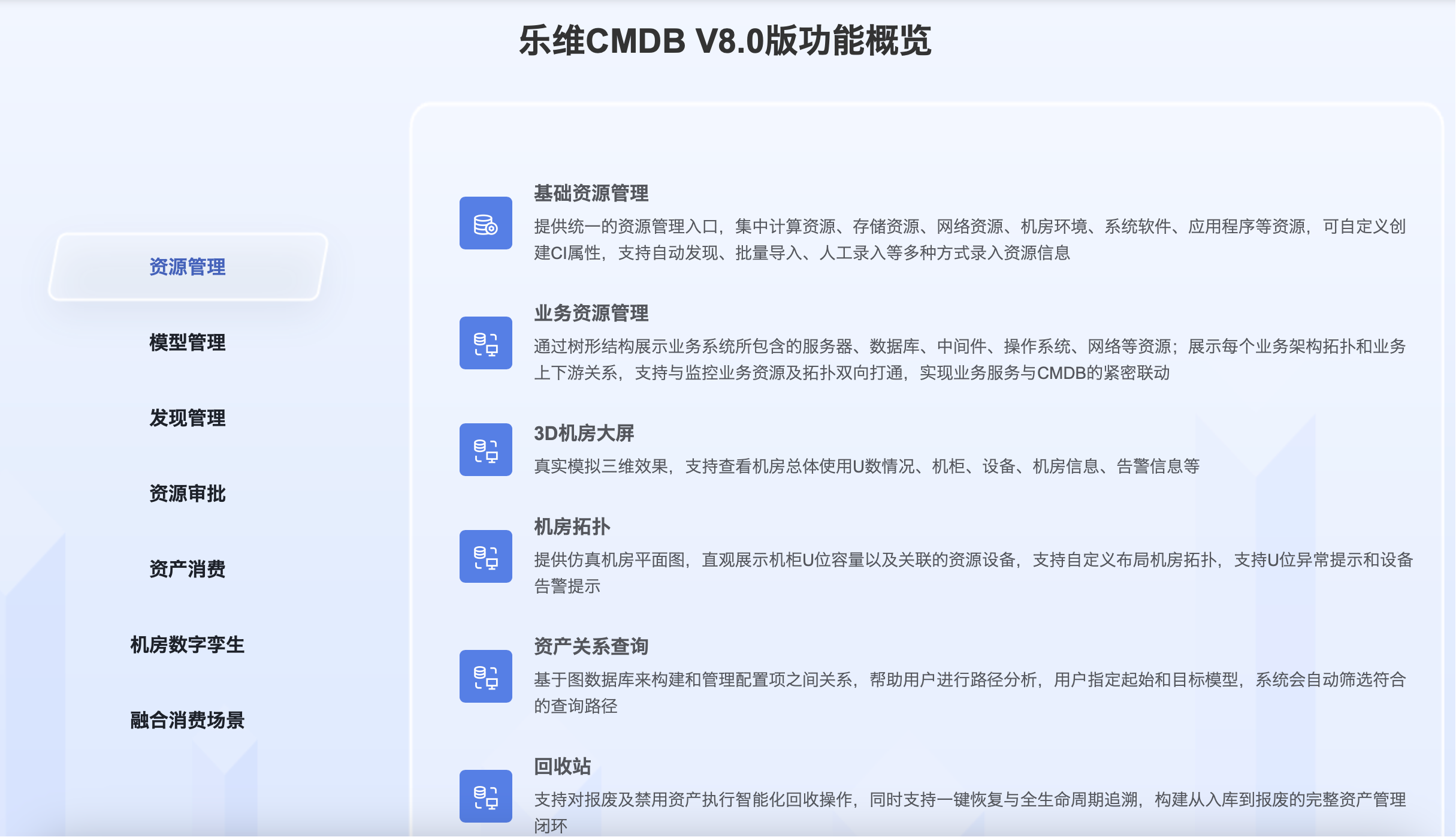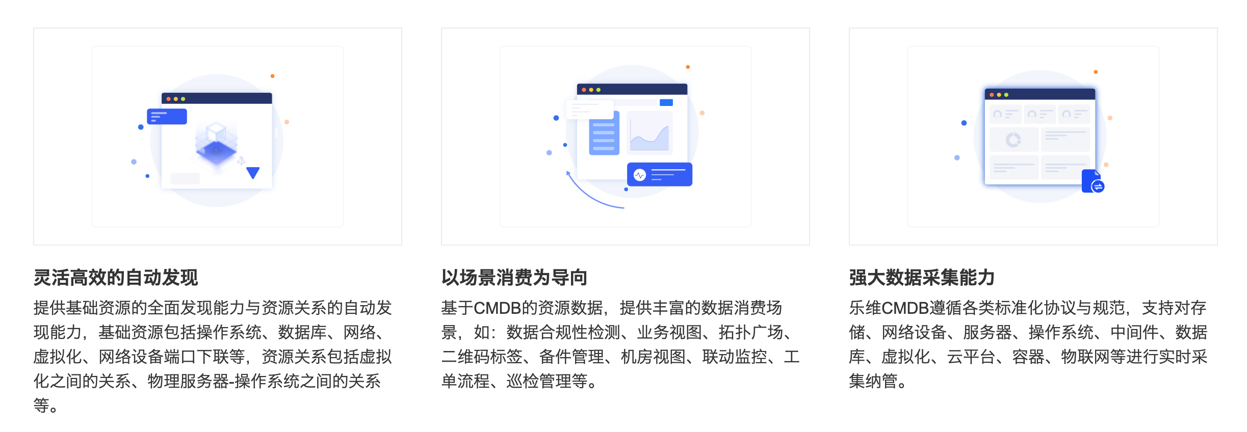 Lerwee乐维CMDB以场景消费为导向,以价值实现为目标,自动企业资产,并将资产信息进行全生命周期管理,实现IT资产自动化、流程化、可视化管理,为监控预警、工单管理等提供数据支撑。